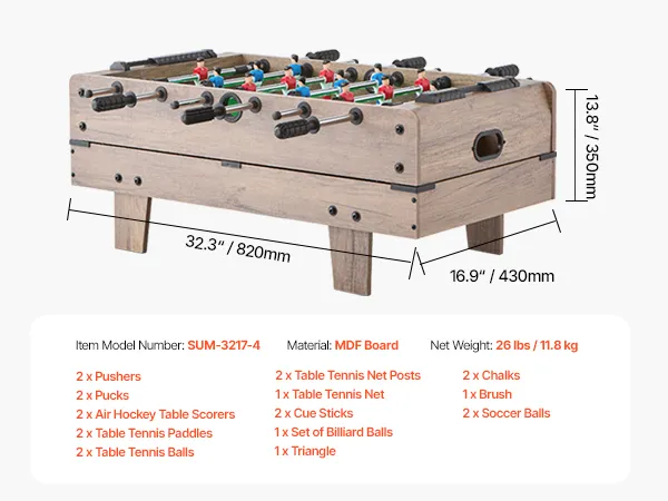 This 4-in-1 multi-function game table combines air hockey, foosball, billiards, and table tennis into one affordable game table for hours of family fun. Its compact design (32.3x16.9x13.8 inch / 82x43x35 cm) with a stackable design saves space effortlessly.