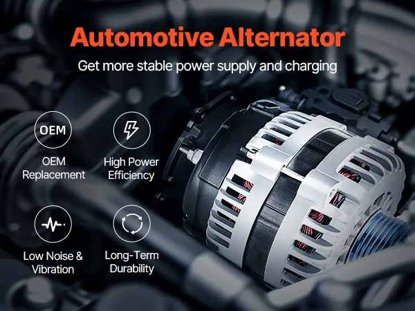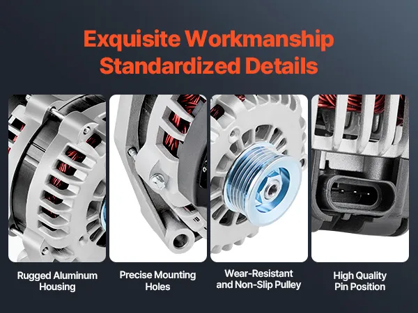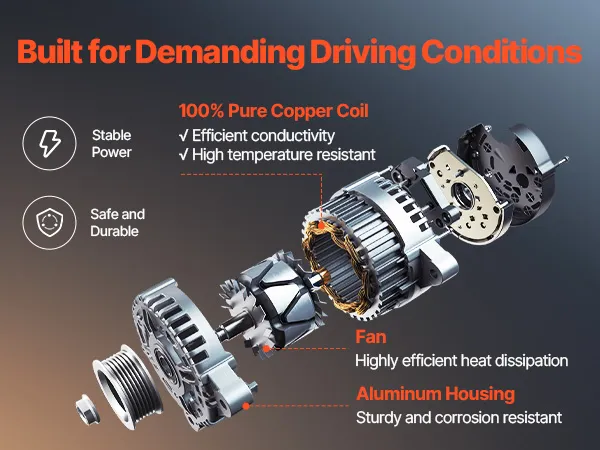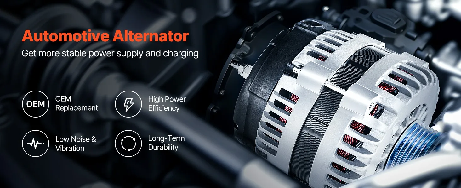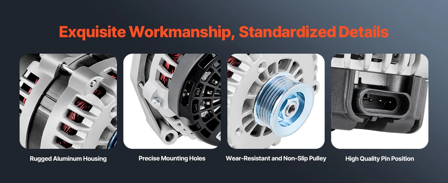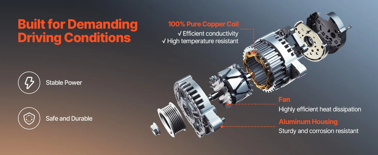 Our alternator replacement features pure copper coils for better durability than aluminum. The aluminum housing and cooling fan boost heat dissipation. It delivers a stable 253A output to support high-load devices like AC and premium sound systems.