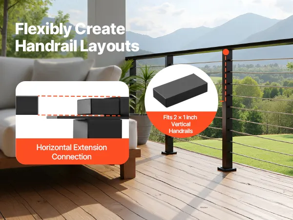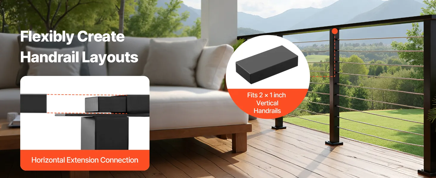 Horizontal Connection: The 180-degree horizontal connection allows seamless handrail extension. This simple design ensures a secure connection, keeping your space tidy, aesthetically pleasing, and easy to use