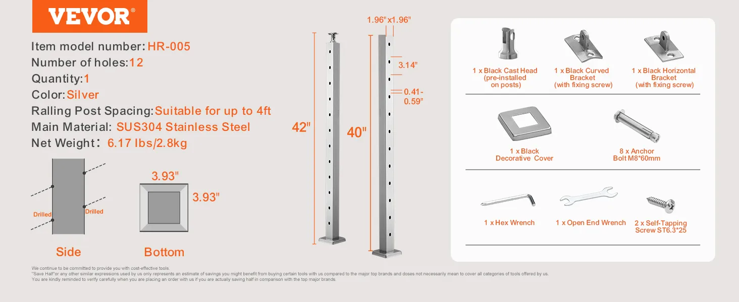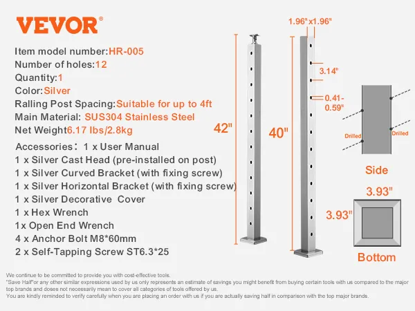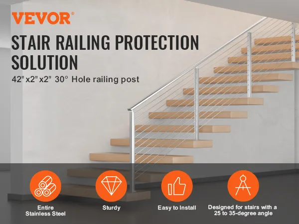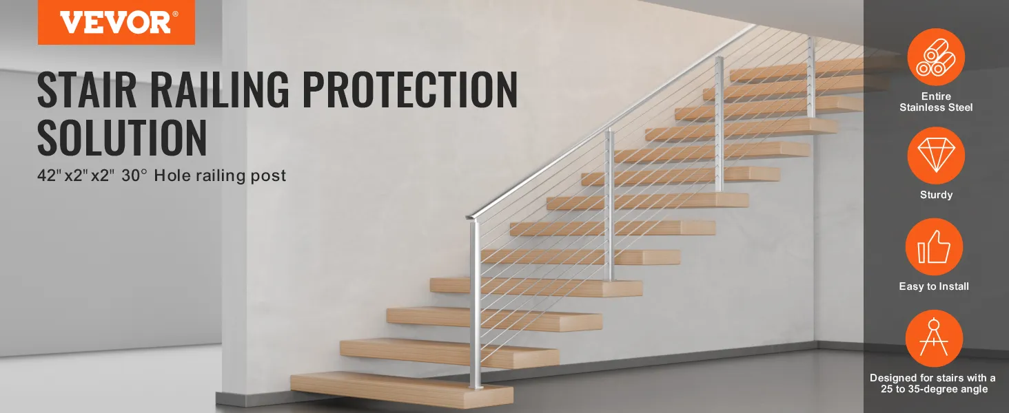 The VEVOR cable railing post is ideal for stairs with angles between 25° and 35°. It enhances safety on staircases, ensuring protection for everyone. The 30° angled hole matches perfectly with stair inclines. You get a secure and stable railing option. This design meets safety standards. It prevents falls and supports safe navigational functions. Its 42 inches height adds to its protective capabilities. It is an excellent solution for residential and commercial staircases. With this product, safety is guaranteed for all users.