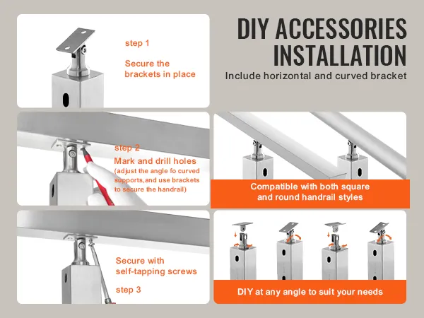 Easy to Install and DIY: Our cable rail post is equipped with horizontal brackets and curved brackets, fitting various hole types in railing posts, compatible with square and round rail styles, allowing for DIY customization of any handrail angle.