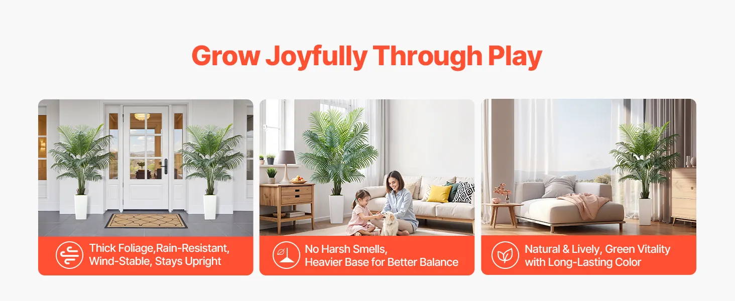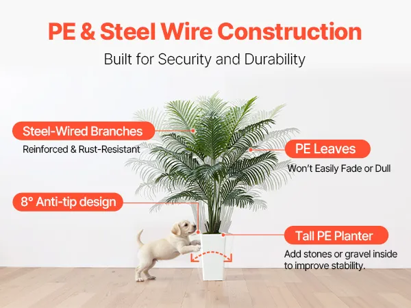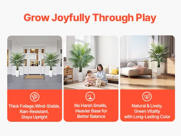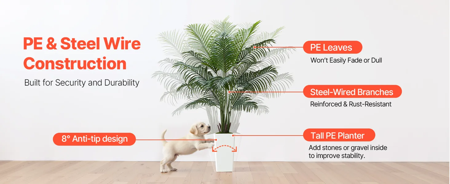 Reliable and Stable Design: Made from sturdy PE material with waterproof structure, these artificial indoor plants stay upright even when tilted up to 8°, making them suitable for homes with pets or active conditions