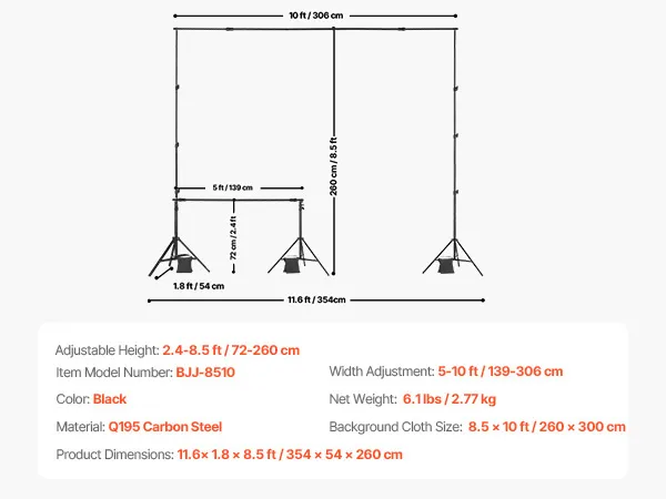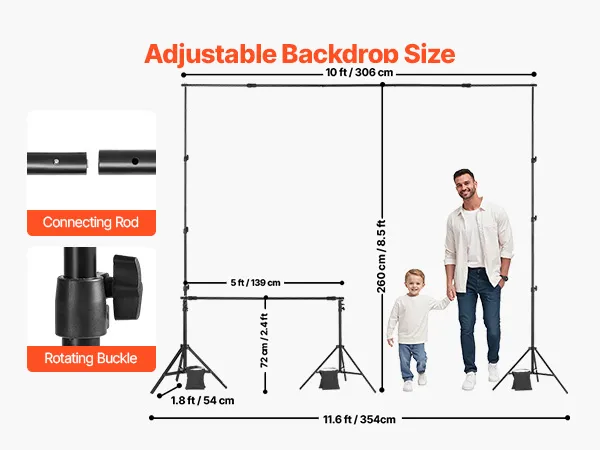 Adjustable Size: Our adjustable backdrop stand supports backdrops up to 8.5 x 10 ft / 260 x 300 cm. The height of support poles can extend from 2.4 ft / 72 cm to 8.5 ft / 260 cm, and the width can extend from 5 ft / 139 cm to 10 ft / 306 cm to fit different backdrop sizes. Note: This product does not include balloons, decorative items, or backdrop fabric.