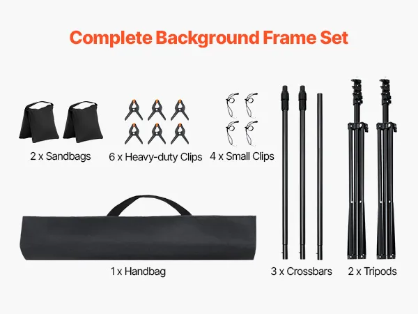 Complete Accessory Set: This photo backdrop frame includes heavy-duty clips to hold backdrops flat and wrinkle-free and sandbags to add weight and stability, especially for outdoor setups.
