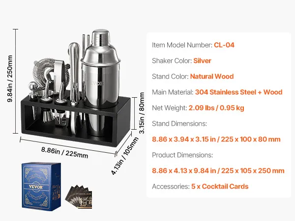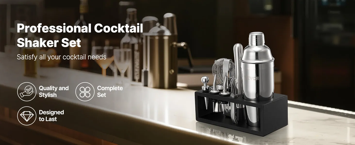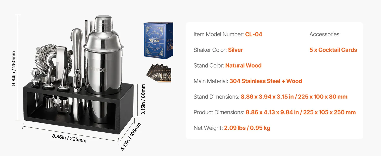 VEVOR Cocktail Shaker Set, 13-Piece Stainless Steel Bar Tools with Bamboo Stand, Martini Bartender Kit Accessories | Mixer Spoon, Muddler, Jigger, Strainer, Liquor Pourers, Ice Tong, Corkscrew, Silver VEVOR Cocktail Shaker Set, 13-Piece Stainless Steel Bar Tools with Bamboo Stand, Martini Bartender Kit Accessories | Mixer Spoon, Muddler, Jigger, Strainer, Liquor Pourers, Ice Tong, Corkscrew, Silver