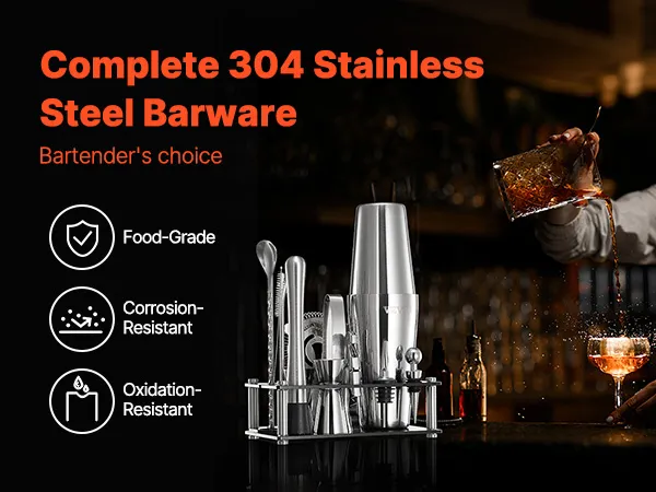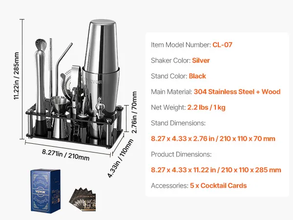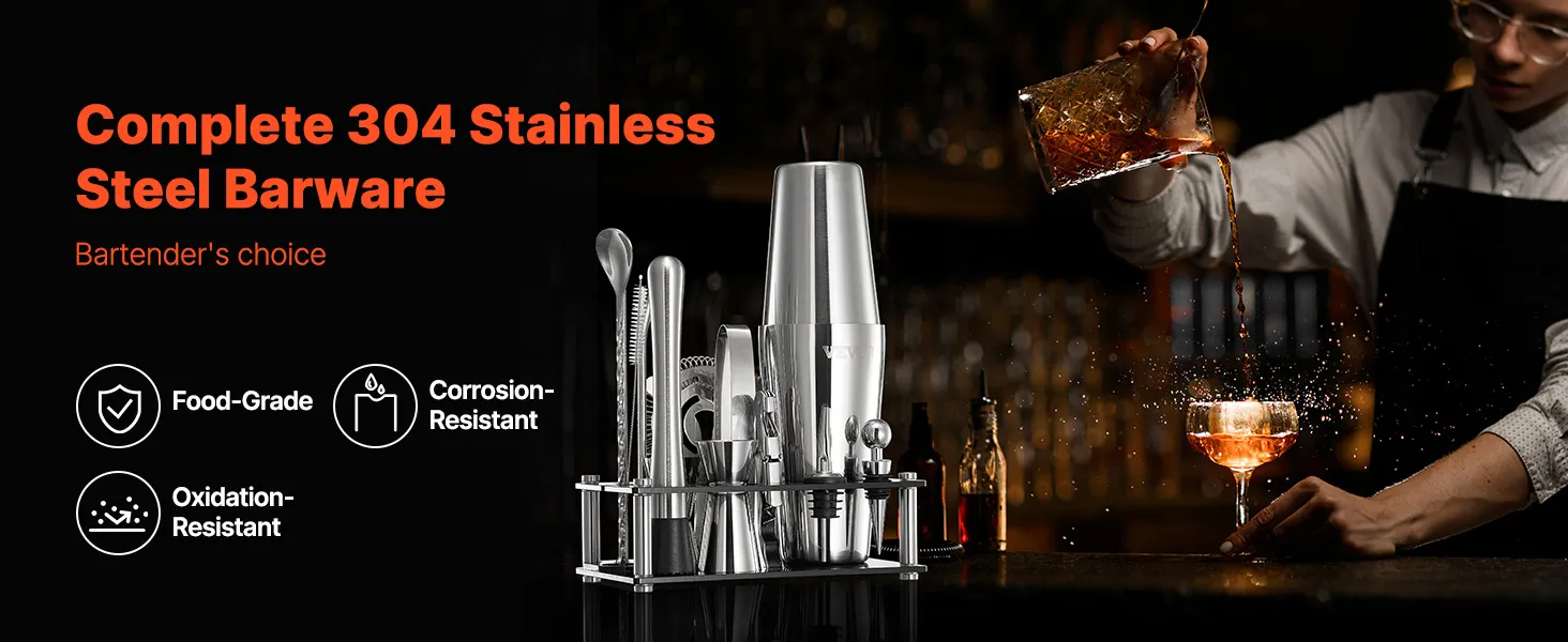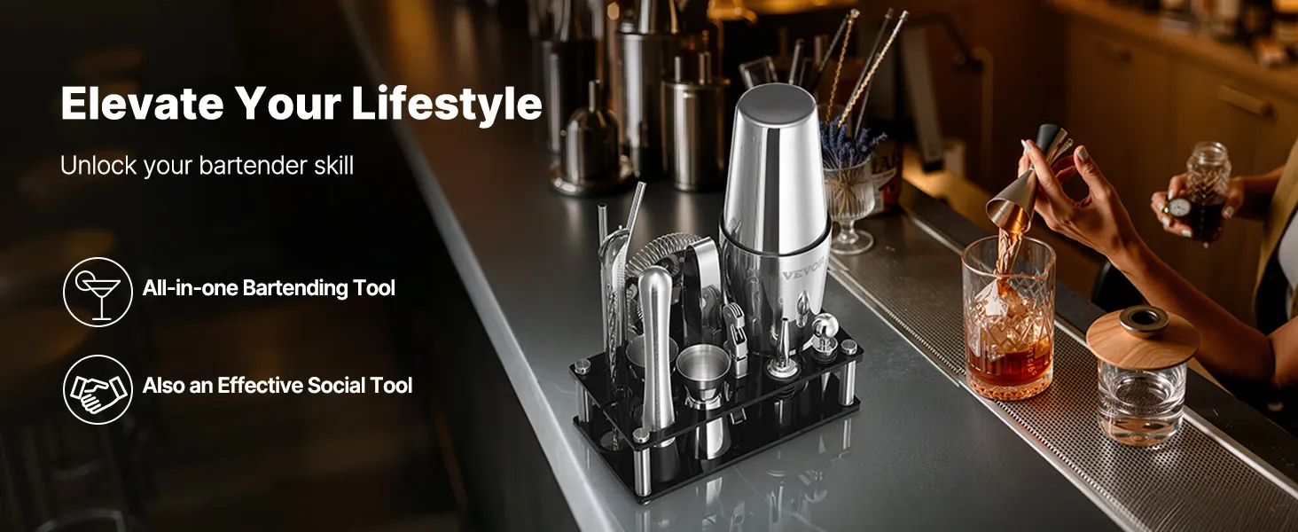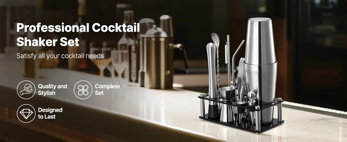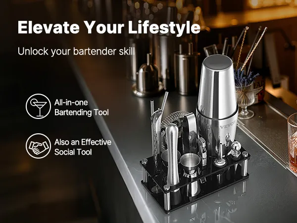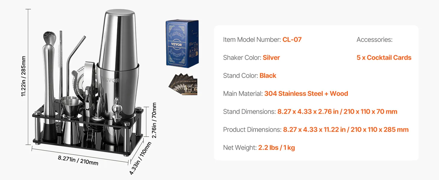 VEVOR Cocktail Shaker Set, 14-Piece Stainless Steel Bar Tools with Acrylic Stand, Boston Bartender Kit Accessories | Mixer Spoon, Muddler, Jiggers, Strainer, Liquor Pourer, Ice Tong, Corkscrew, Silver VEVOR Cocktail Shaker Set, 14-Piece Stainless Steel Bar Tools with Acrylic Stand, Boston Bartender Kit Accessories | Mixer Spoon, Muddler, Jiggers, Strainer, Liquor Pourer, Ice Tong, Corkscrew, Silver