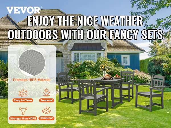 This patio dining set offers both comfort & style. The chairs come with cushions that add extra comfort for long dinners. Its strong metal webbing in the chair seats gives a firm yet comfortable seating experience. Despite its heavy-duty design, the set remains stylish and modern as well. The dark, sleek finish of the HIP material provides an upscale look, making it incredibly versatile for any outdoor space. No matter if you’re hosting a family dinner or having friends over, this set guarantees utmost comfort while meeting them.