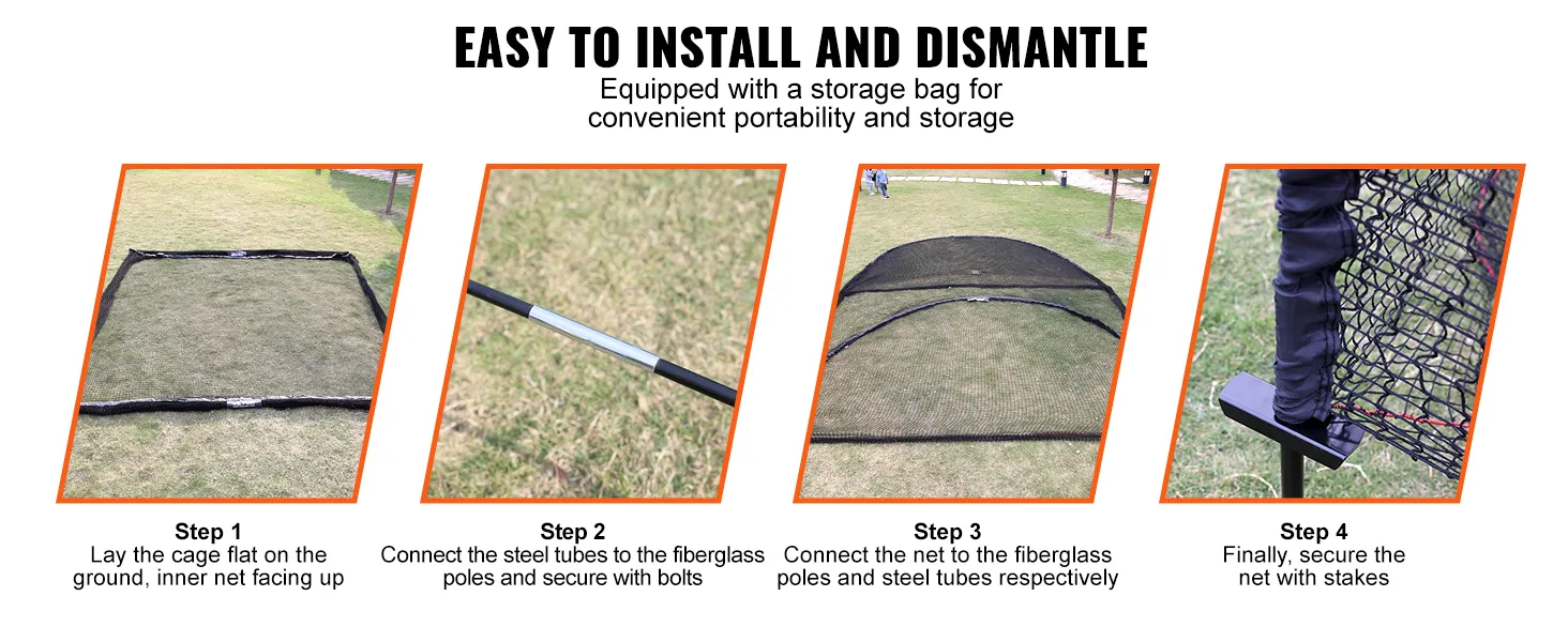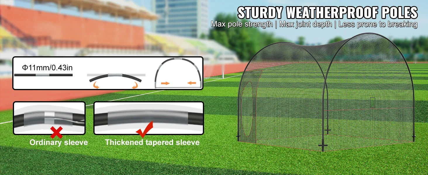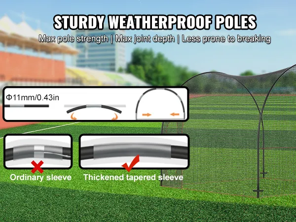 Heat-resistant Fiberglass Poles: This heavy duty pitching cage is made from high-quality fiberglass and cured at high temperatures, these poles are sturdy and durable. The reinforced tapered sleeve enhances the depth of the connections, ensuring a more stable joint that is less likely to break, effectively preventing the batting cage from collapsing due to wind and rain. Note: avoid prolonged outdoor exposure and store timely for longer life.
