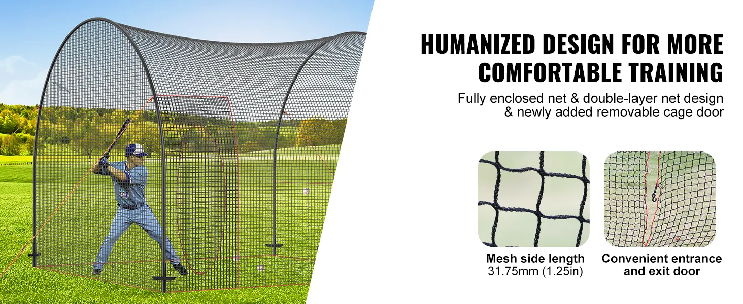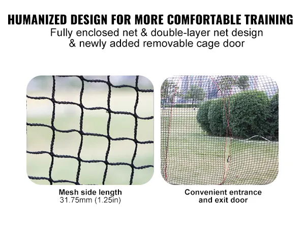 User-friendly Design: The addition of a removable cage door and a pitching machine opening offers a more perfect training experience, tailored to the training habits of players and suitable for athletes of all ages. The removable cage door allows easy access, and the pitching machine opening can accommodate a machine simulating pitches at 90 miles per hour, helping in training and improving the player's batting accuracy and power.