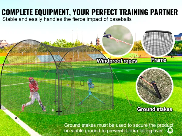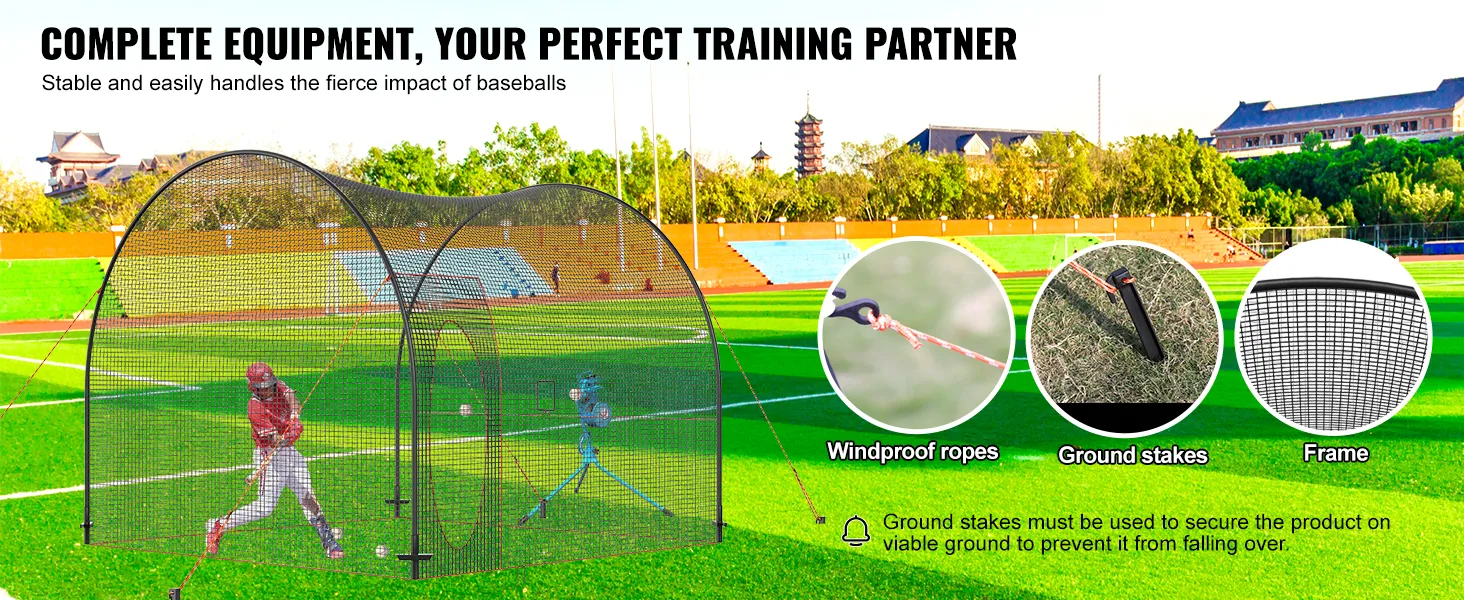 An ideal baseball batting cage setup that, when paired with a pitching machine, can handle ball speeds of up to 90 miles per hour. The design includes multiple ground stakes for reinforcement, ensuring durability and stability.