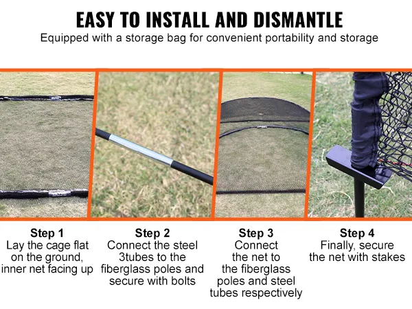 Easy to Install: This enclosed hitting cage can be successfully installed by just two people. Its simple structure and instructions make the setup straightforward, with all necessary accessories included for a seamless installation. It comes with a storage bag for easy portability, making it suitable for carrying to indoor or outdoor sports fields.
