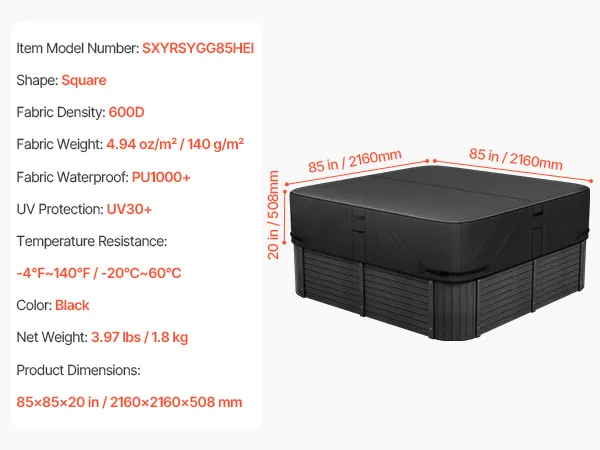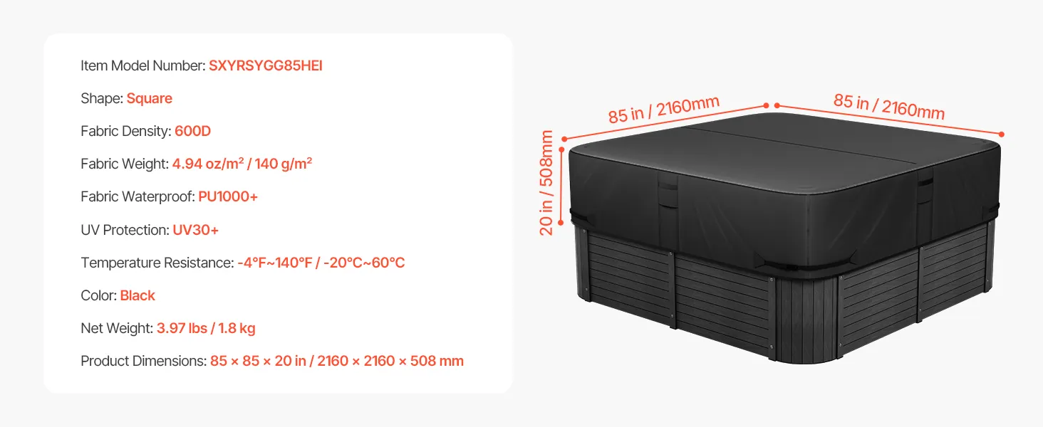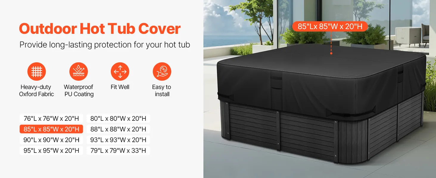 Proper Size: This hot tub cover perfectly fits your hot tubs with dimensions 85"L x 85"W x 20"H (2160 x 2160 x 508 mm). Please note: Be sure to measure the length and width of your hot tub before ordering to ensure a proper fit