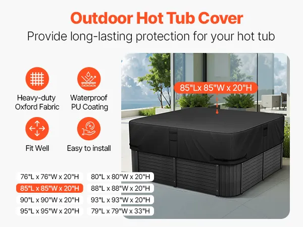Our hot tub cover is designed for outdoor use, with dimensions of 85"L x 85"W x 20"H (2160 x 2160 x 508 mm). Please note: Be sure to measure the length and width of your hot tub before ordering to ensure a proper fit.