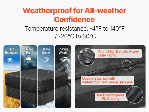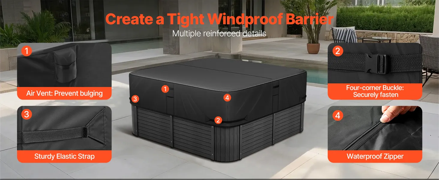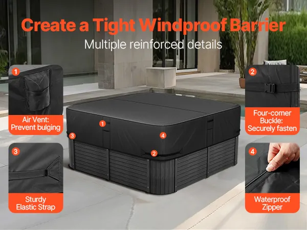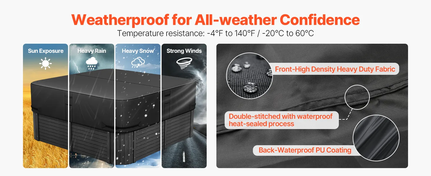 Heavy-Duty Oxford Fabric: The tough and durable Oxford fabric is wear-resistant and tear-resistant, with strong anti-aging and anti-deformation capabilities. It remains resistant to aging, brittleness, and deformation even after long exposure to outdoor elements like wind, rain, snow, and sun, providing reliable protection for your hot tub and extending its lifespan