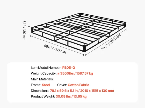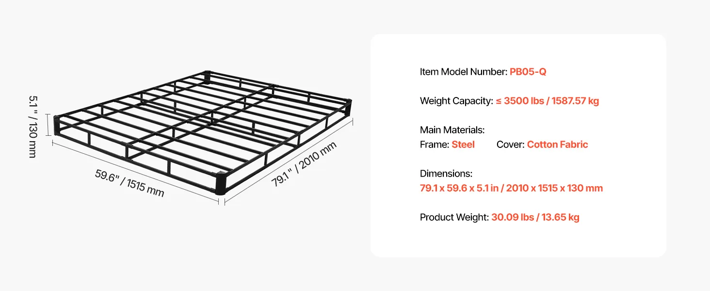 VEVOR Box Spring, Queen Size Bed Frame with Washable Fabric Cloth, Heavy Duty Metal Frame for Queen Bed, 5 in Mattress Foundation, 3500 lbs Max Weight Capacity, Easy Assembly, 79.1L x 59.6W x 5.1H in