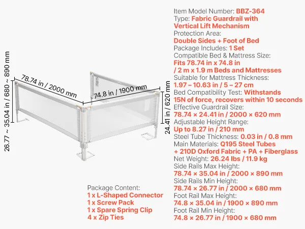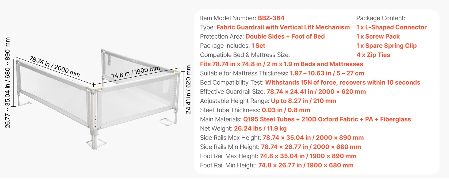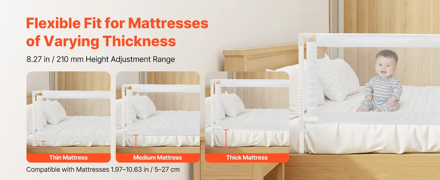 Fits Most Beds: Height adjusts up to 8.27 in / 210 mm and fits bed side up to 78.74 x 74.8 in / 2.0 x 1.9 m. Compatible with mattress thicknesses from 1.97–10.63 in / 5–27 cm. Works with solid-wood frames, kids’ beds, platform/flat bases, mattresses, and other beds