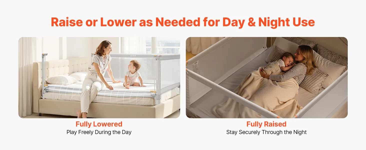 Raise or lower the bed rail with one hand. Drop it during the day for unobstructed access or bedside play; lift it at night for added protection and peace of mind.