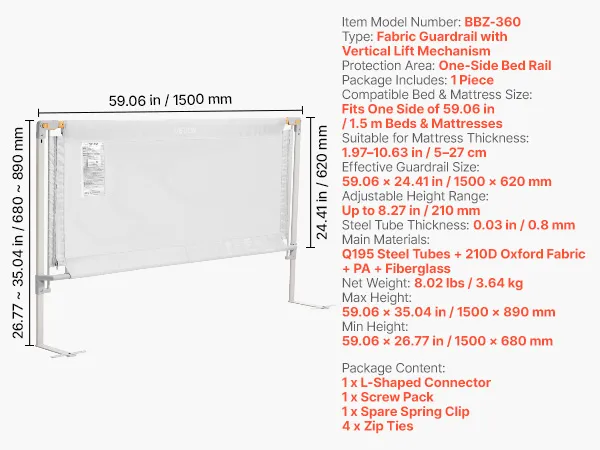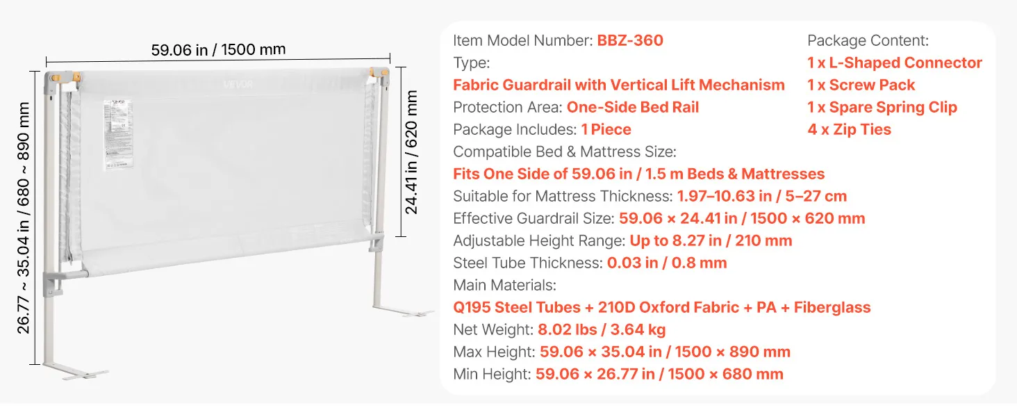 Fits Most Beds: Height adjusts up to 8.27 in / 210 mm and fits one bed side up to 59.06 in / 1.5 m. Compatible with mattress thicknesses from 1.97–10.63 in / 5–27 cm. Works with solid-wood frames, kids’ beds, platform/flat bases, mattresses, and other beds
