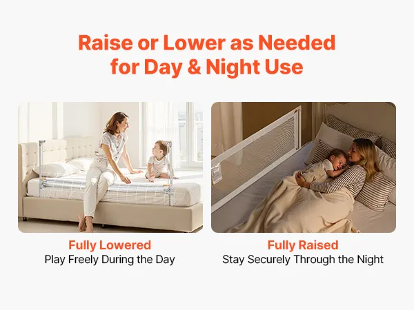 Easy Operation: Single-side lift and one-hand control make getting in and out of bed with your child more convenient. When it’s story time, the top rail folds down so you can sit at the bedside. A child lock helps avoid accidental opening