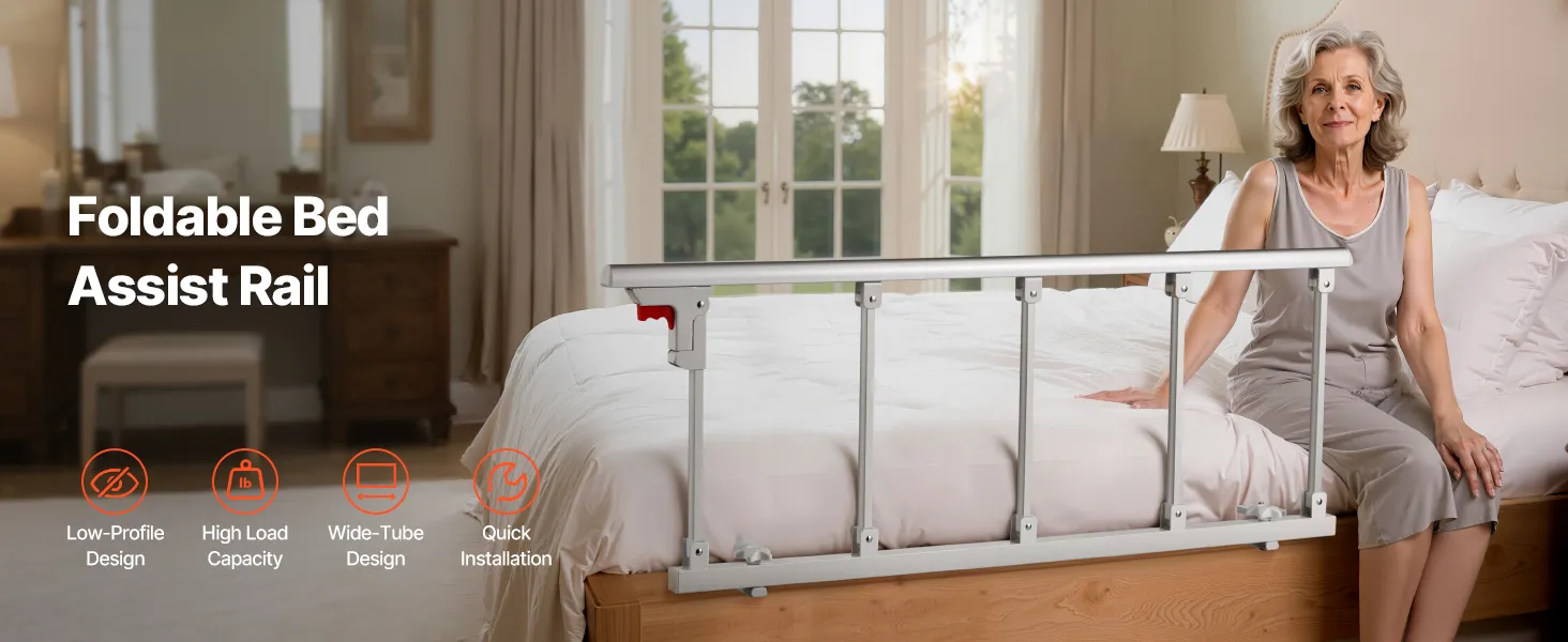 Easily folds and hides by the bed edge, facilitating getting in and out of bed, optimizing space, and minimizing the risk of bumps or trips to keep users secure.