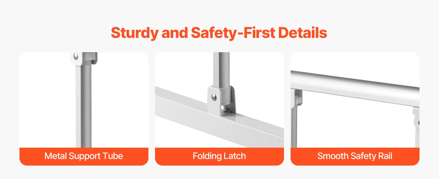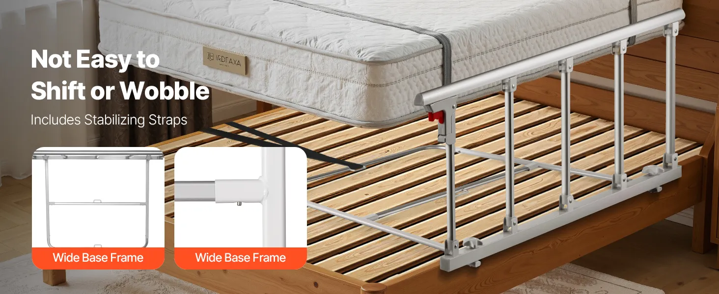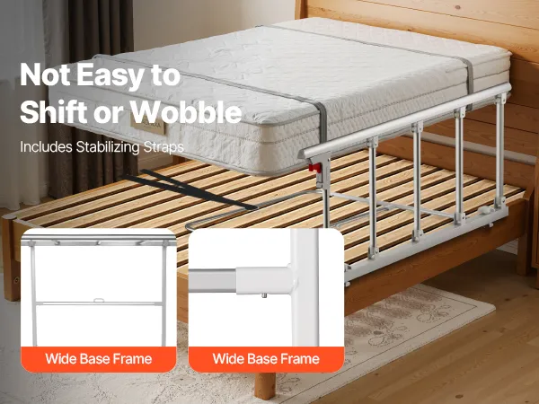 The included straps securely lock the rail in place, avoiding wobbling or shifting during use. The widened base frame with a middle connecting tube increases the contact area, ensuring even more stable support.