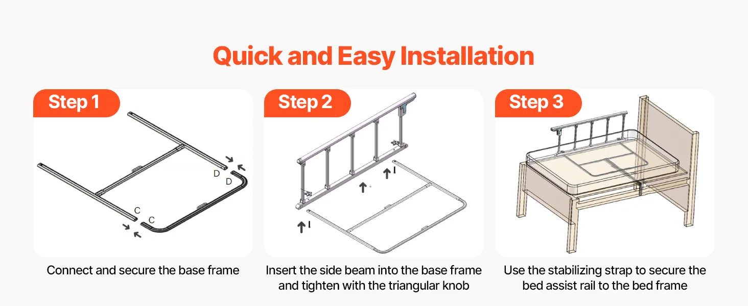 Quick & Easy Installation: The elderly bed rail is easy to assemble without tools or professional help. Simply follow the instructions to set it up in minutes.