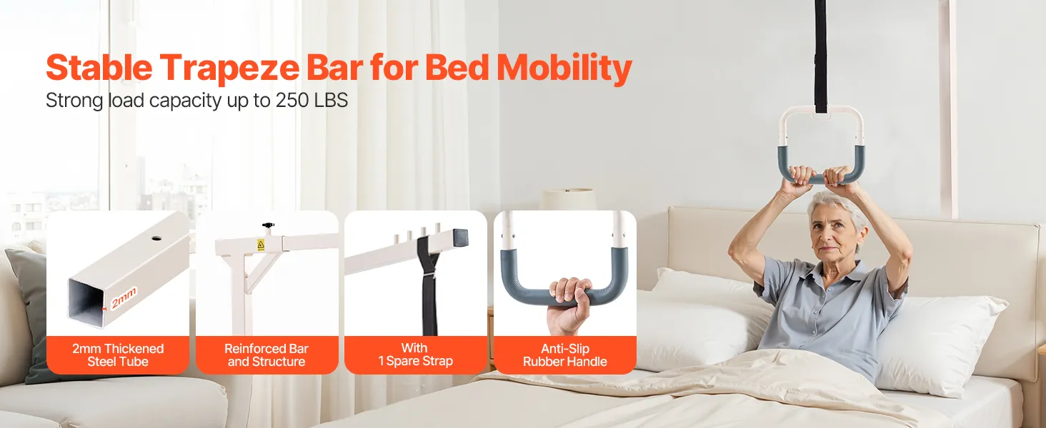 Our free standing trapeze bar comes with a set of assembly hardware and is easy to install, requiring no complicated tools. It can be set up effortlessly to provide strong and reliable support, assisting daily mobility and enhancing quality of life.