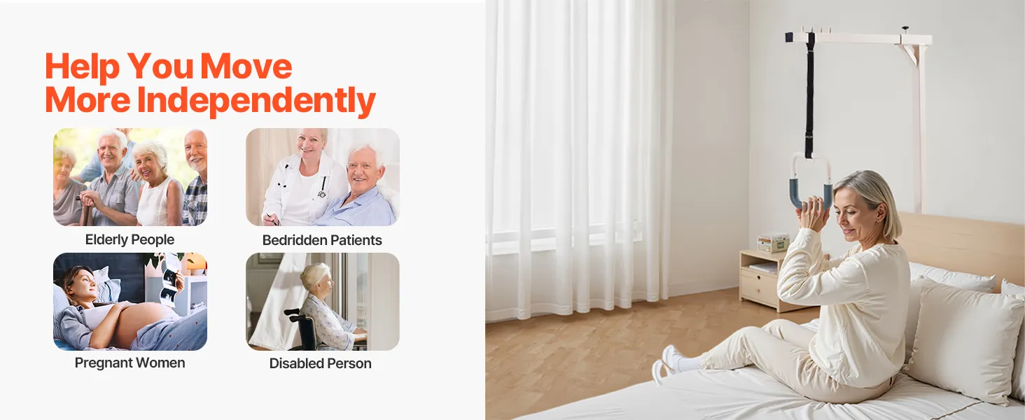 This bed trapeze bar is ideal for seniors, bedridden patients, pregnant women, and individuals with limited mobility, providing stable support for effortless sitting up, transferring to a wheelchair, or adjusting posture. An essential aid for daily mobility and rehabilitation needs.