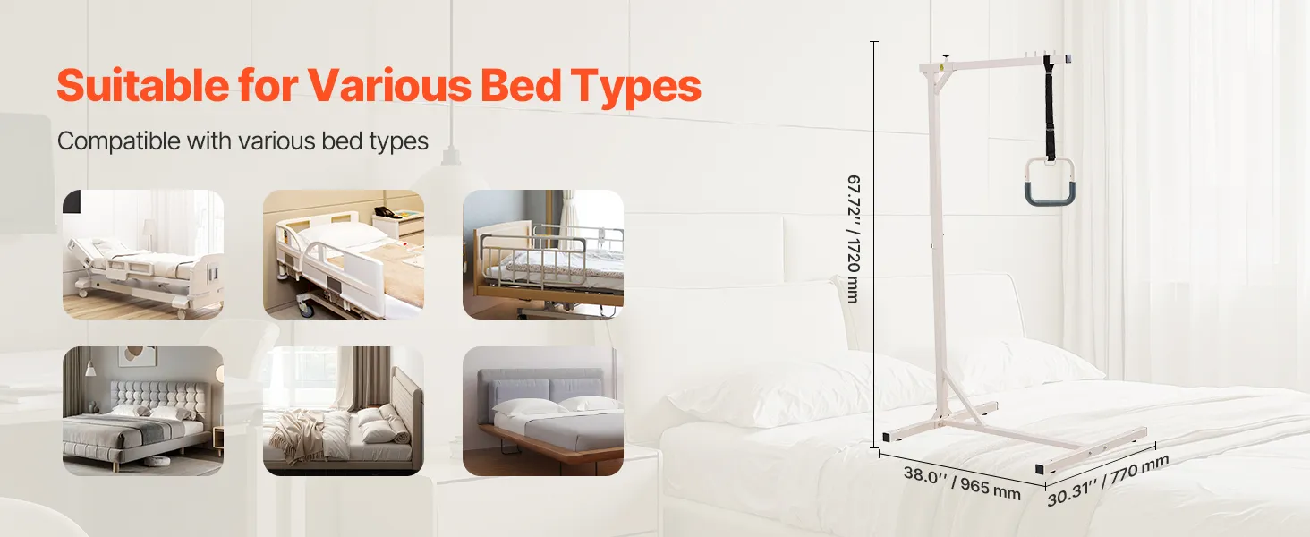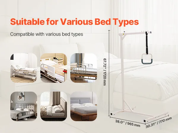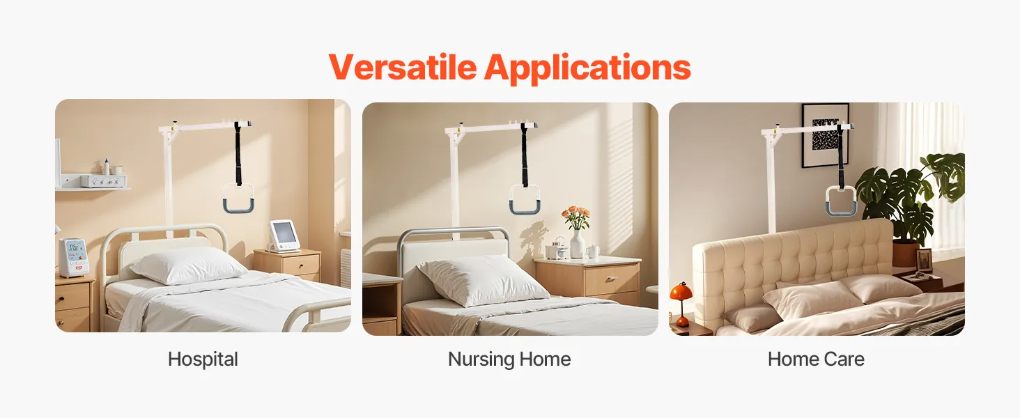 Whether it's a normal hone bed, nursing bed, or hospital bed, this trapeze bar is widely compatible, offering stable and reliable support. Ideal for home care or hospital use, it meets your varied needs, aiding users in safely adjusting positions and helping with recovery and mobility.