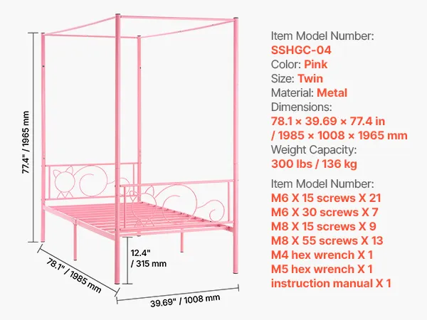 Sturdy Metal Construction: Our canopy bed features a reinforced metal frame with a four-post canopy design and strengthened slats to avoid mattress sagging. Supports up to 300 lbs / 136 kg for reliable stability