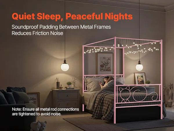 Noise-Free Design: Soundproof padding at metal joints reduces friction noise, ensuring a quiet and comfortable sleeping environment with the twin canopy bed