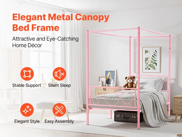 VEVOR Twin Size Canopy Bed Frame, Metal Canopy Bed with Minimalist Headboard & Four Posters Design, Heavy Duty Steel Slats Support, Underbed Storage Space, No Box Spring Needed, Easy Assembly, Pink