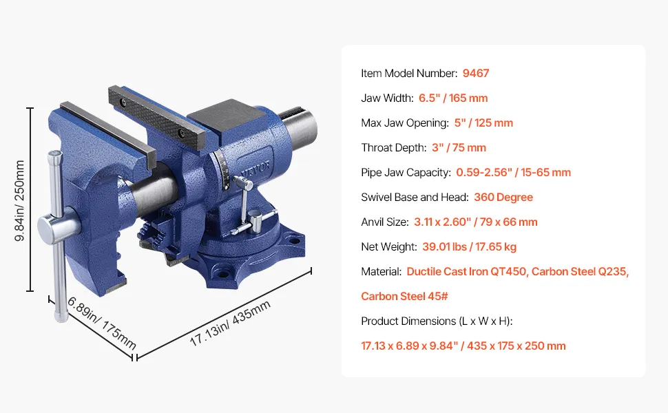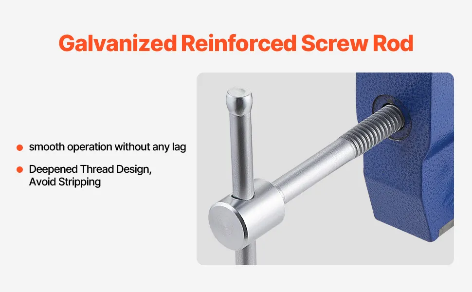 Heavy Duty Bench Vise: Crafted from premium ductile cast iron, our multipurpose bench vise offers outstanding durability and stability. With a jaw-clamping force of up to 5520 lbs (24.98 kN), it's built to withstand long hours of heavy-duty use, making it the ultimate companion for years to come.
