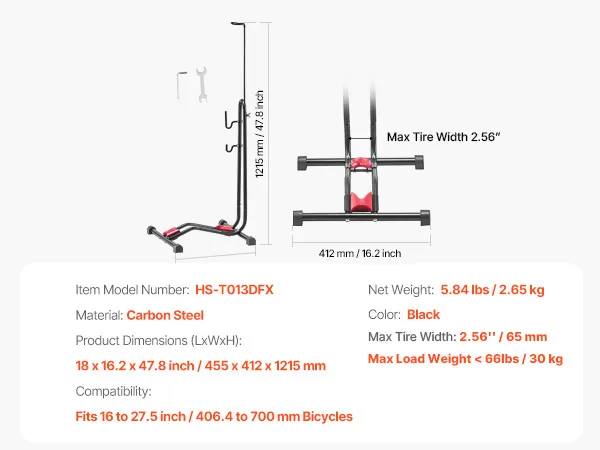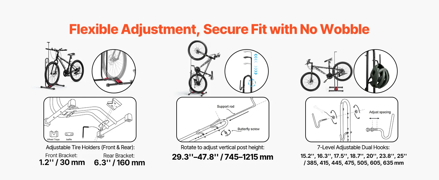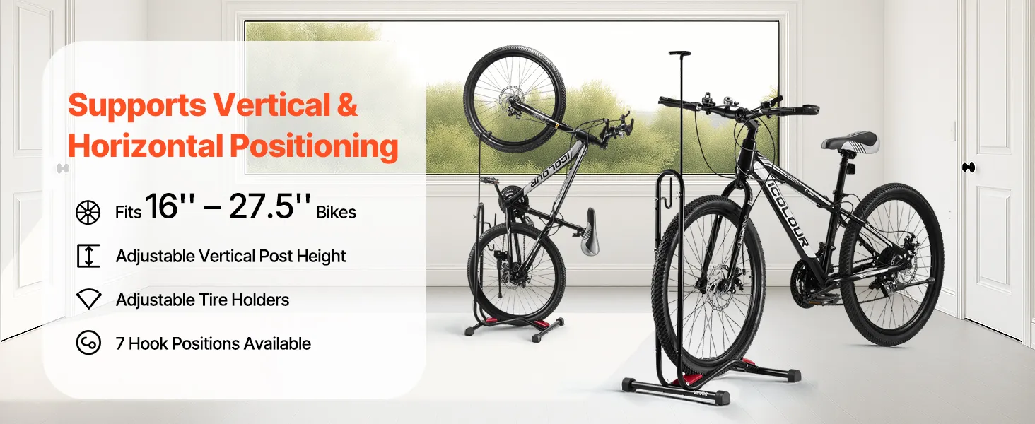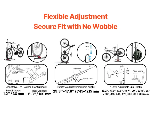 High Compatibility: This bike stand fits mountain and road bikes from 16 to 27.5 inches, with an upright bar adjustable from 29.3 to 47.8 inches. It features forward-and-back tire holders and dual hooks with 7 slots, making it great for storing bikes or other items