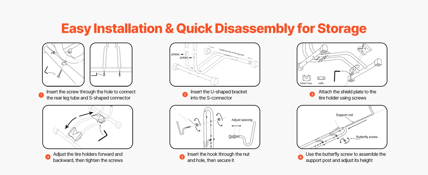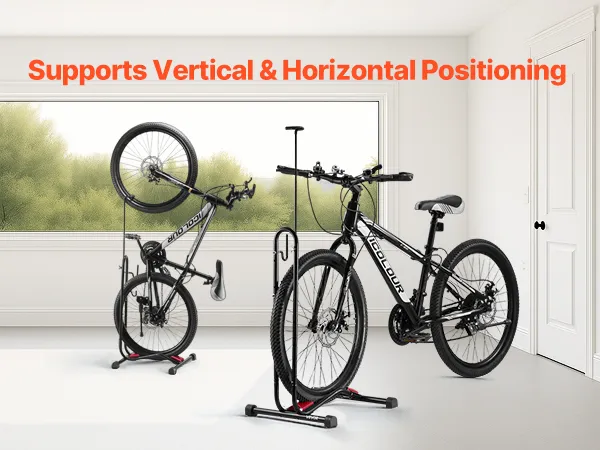 Flexible Parking: Our floor bike stand lets you park in four different ways: front wheel or rear wheel in, and vertically or horizontally. The flexible placement options easily adapt to any space you have at home