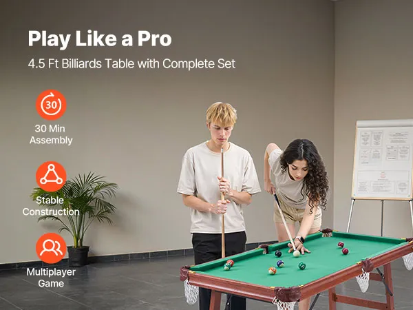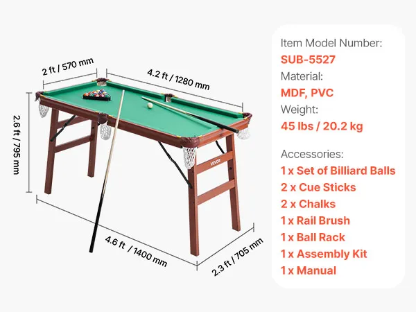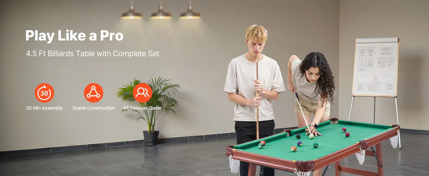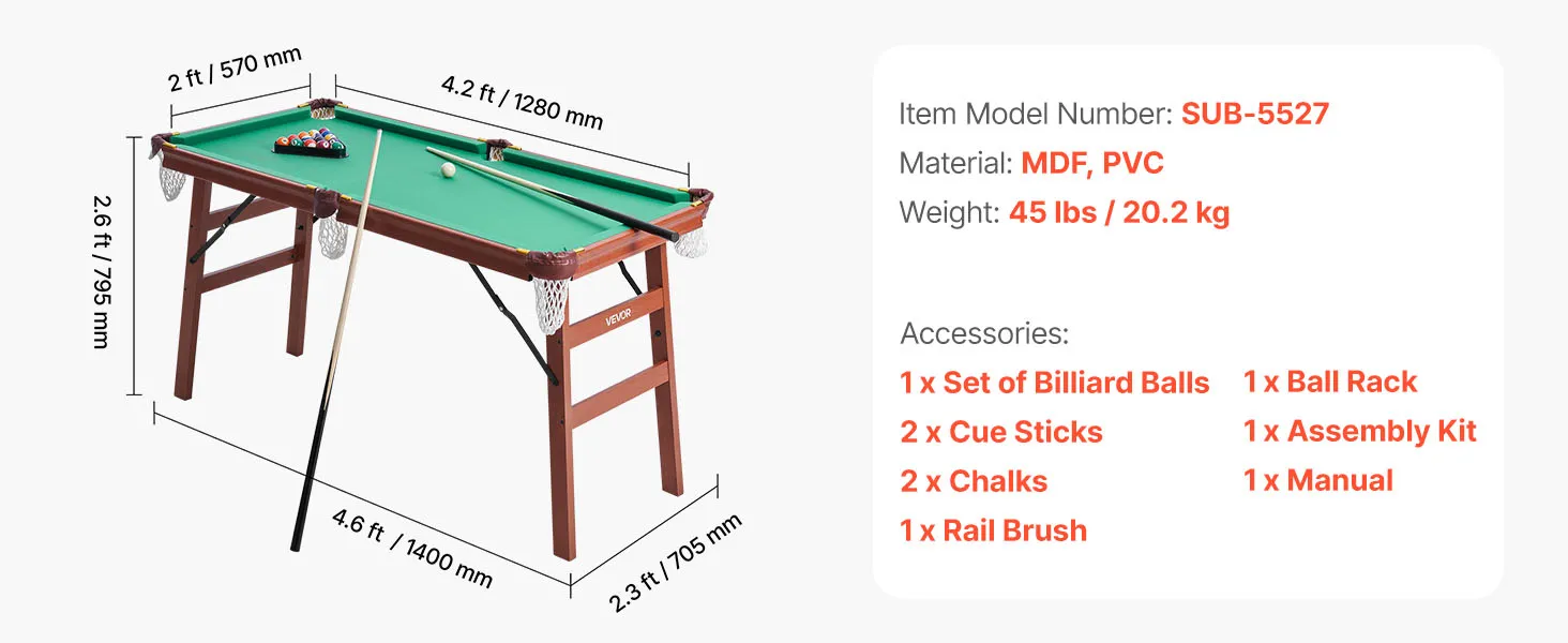 All-Included Kit: Cues, balls, chalk, brush, triangle – everything's in the box. No missing parts. Open our pool table, unfold legs, and start your first match in minutes