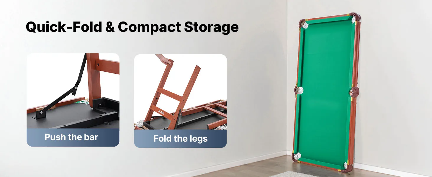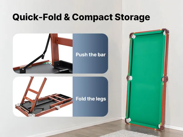 Easily fold the table for compact storage, eliminating concerns about bulky furniture. This portable billiards table is great for small spaces or convenient storage under beds.
