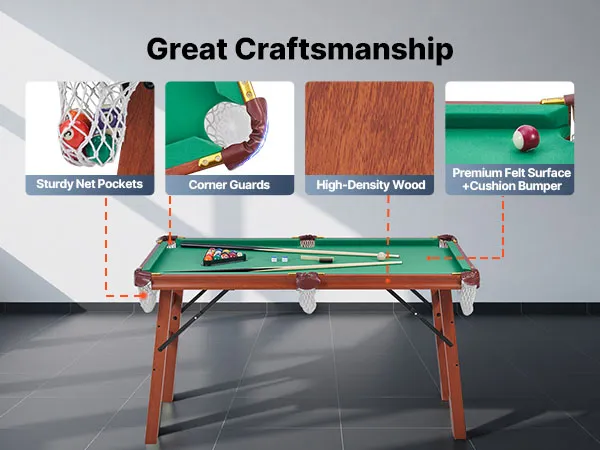 Exquisite Details: Reinforced nets hold balls tight, while corners guard your table and walls. No more scratched floors or tilted shots. Premium felt surface and cushion bumper add a touch of elegance and durability to the pool table