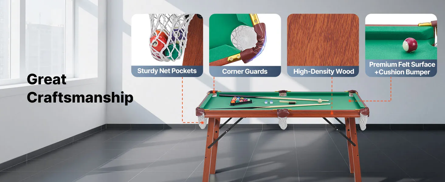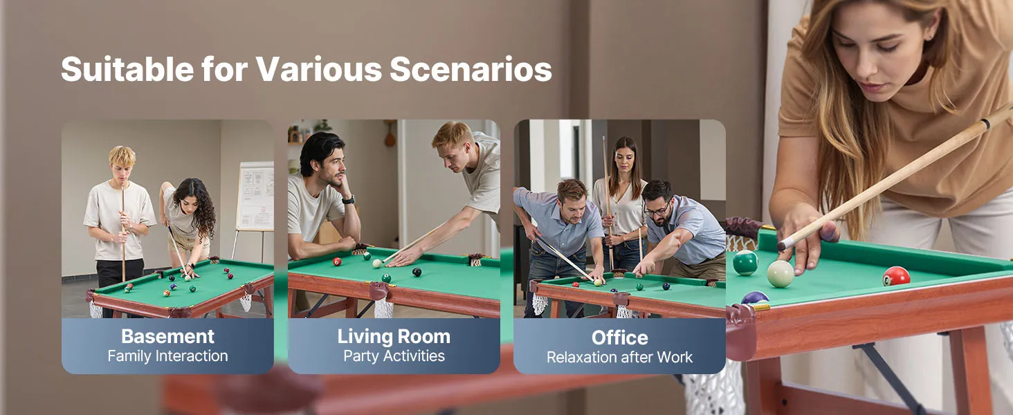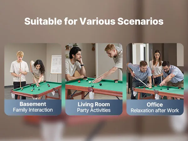 Versatile Usage: From basements to offices, this family game room pool table is ideal for various occasions. It's easy to move to parties, family rooms, or even the garage. Instant fun, zero effort