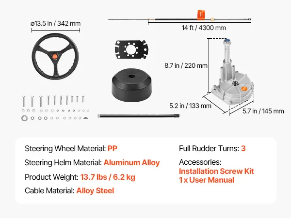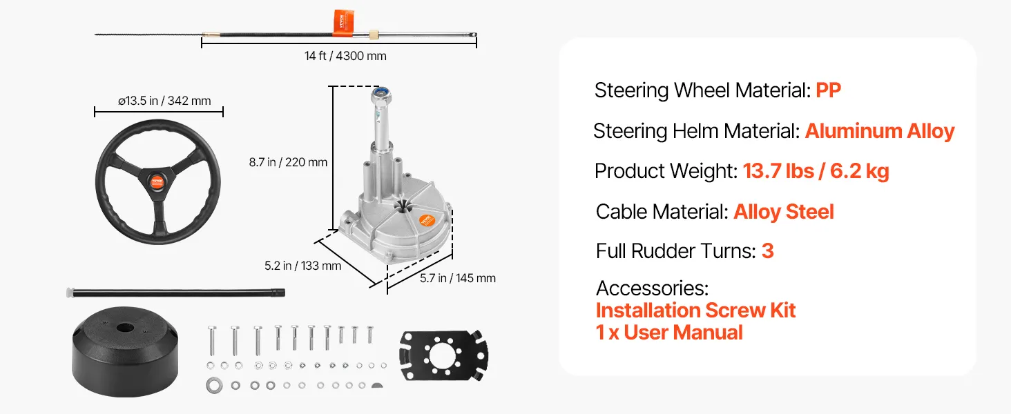 High-Performance Rotary Steering System: The VEVOR boat steering system kit is specially designed and developed for marine use. It comes with a 14 ft steering cable, a standard 3/4" tapered shaft, a swivel helmet, a 13.5" steering wheel, a 90-degree bezel kit, and hardware. Enables the vessel to steer accurately and improves work efficiency. Take control of your boat, and create waves all summer long.