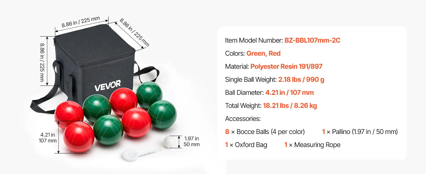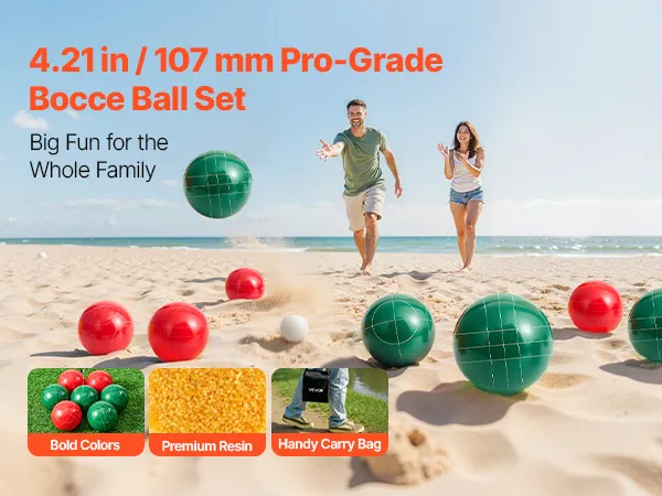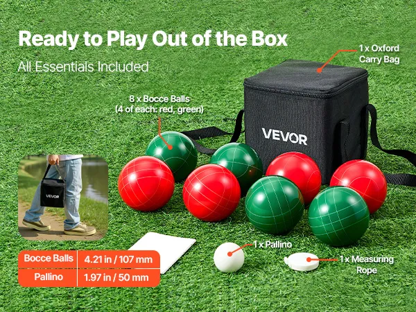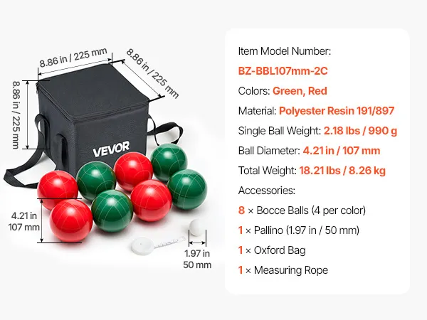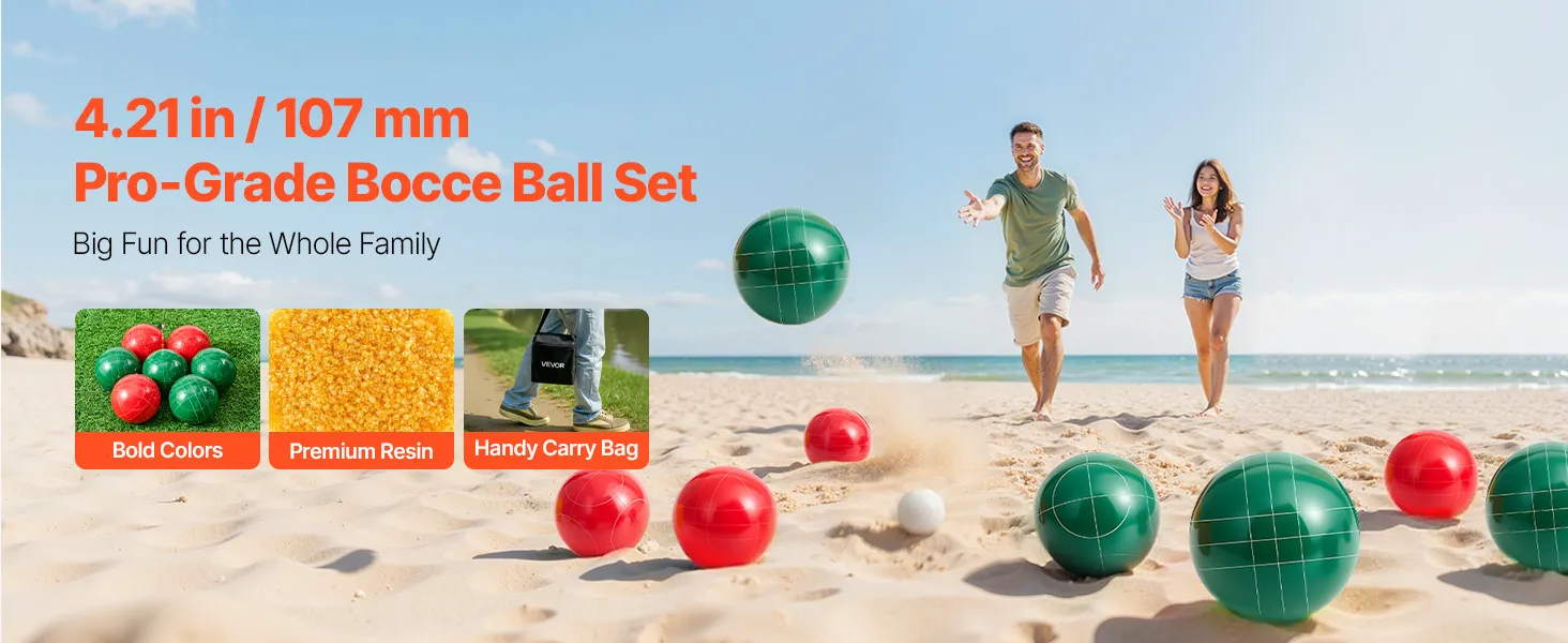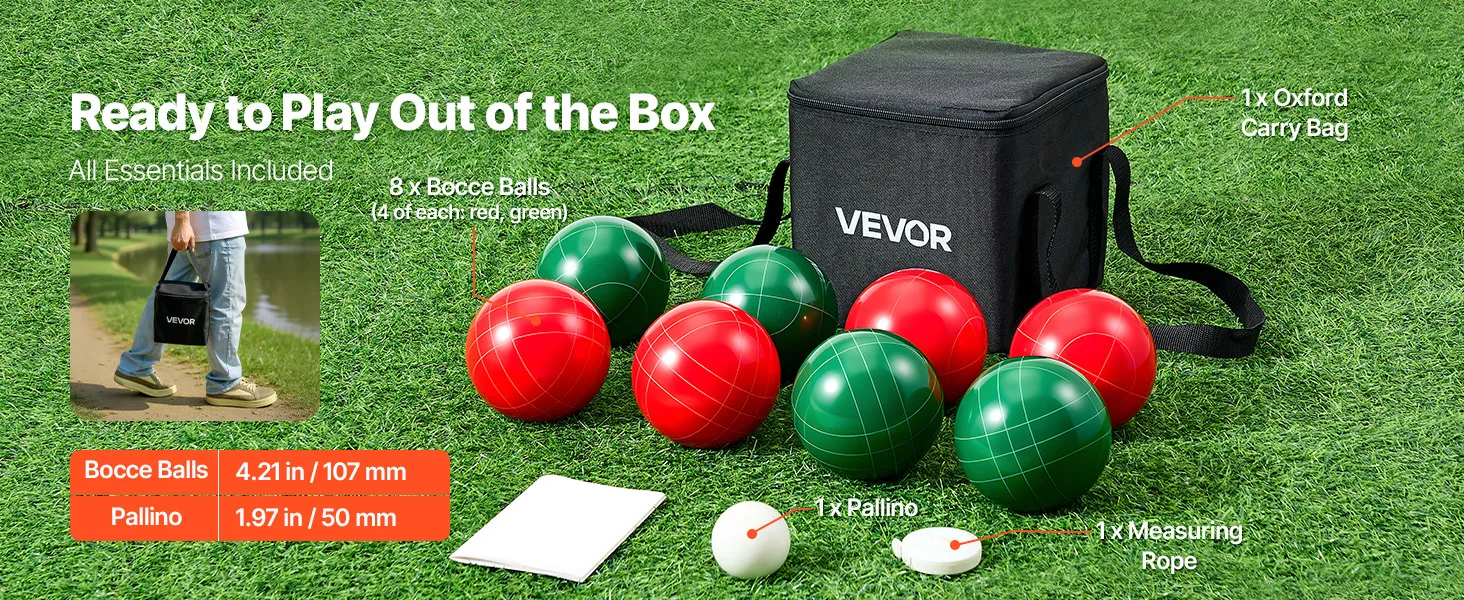 VEVOR Bocce Ball Set, 107 mm, with 8 Resin Balls, Pallino, Carrying Bag and Measuring Rope, Red and Green 2 Colors, for 2 to 8 Players, Bocce Ball Game Set for Beach, Lawn, Family Backyard, Outdoor