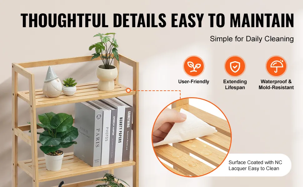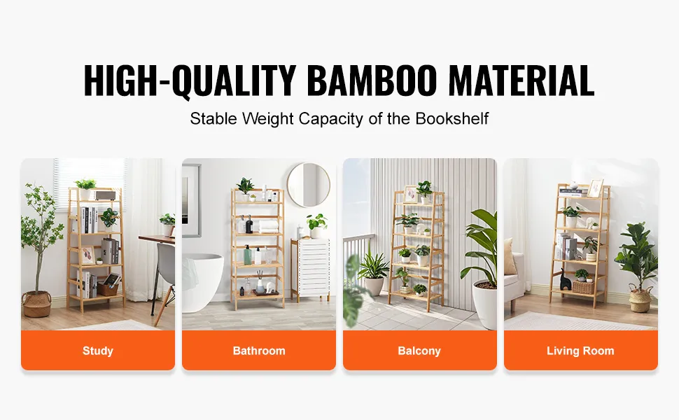 The surrounding crossbars add extra stability to prevent items from falling. The bamboo bookshelf is coated with waterproof NC varnish, making it odorless, easy to clean, and low maintenance.