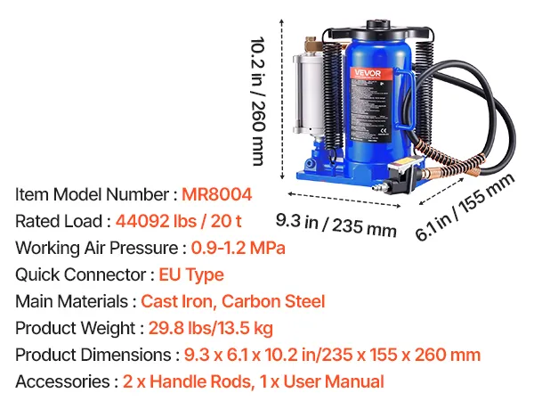This manual and pneumatic hydraulic bottle jack uses hydraulic force to lift up to 20 tons with stability. It handles heavy-duty tasks like vehicle repairs or home maintenance on box trucks, RVs, pickups, and SUVs.