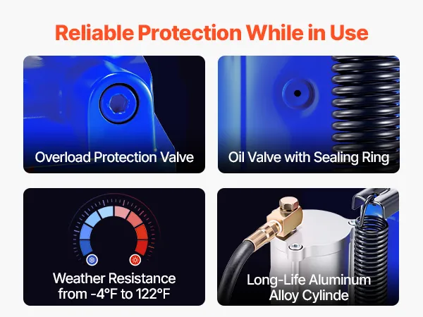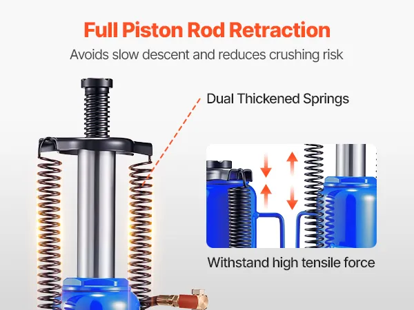 Protection Design: The bottle jack's aluminum alloy cylinder seals tightly for lasting performance. A built-in valve helps avoid overload and the oil fill port stays leak-free. Dual springs reset the piston quickly, so you're ready for the next job