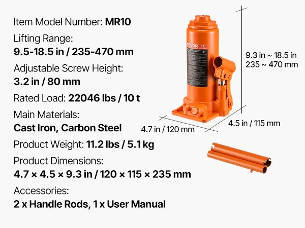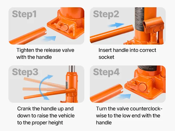 Effortless Operation: No need to strain with this bottle jack—use the 2-piece handle and sliding pump to lift your load. Ready to lower? Turn the valve slowly counterclockwise for safe descent. Always use jack stands to hold the weight after lifting