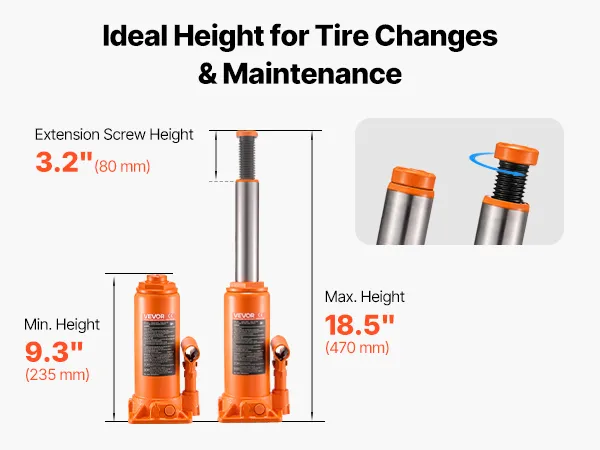 Wide Lifting Range: From low to high, this high lift bottle jack's got the range. It lifts from 9.3 in (235 mm) up to 18.5 in (470 mm), with a 3.2 in (80 mm) screw for fine-tuning the height—handy when space is tight