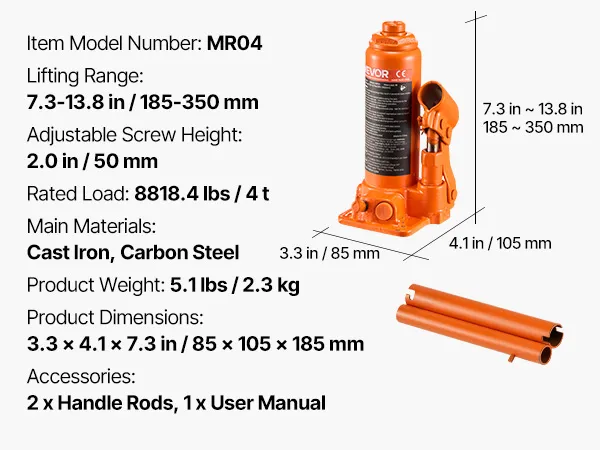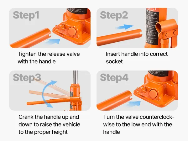 Effortless Operation: No need to strain with this bottle jack—use the 2-piece handle and sliding pump to lift your load. Ready to lower? Turn the valve slowly counterclockwise for safe descent. Always use jack stands to hold the weight after lifting