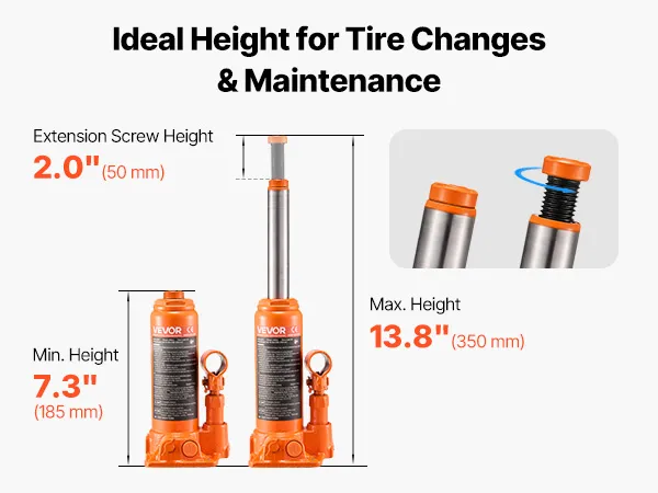 Wide Lifting Range: From low to high, this high lift bottle jack's got the range. It lifts from 7.3 in (185 mm) up to 13.8 in (350 mm), with a 2.0 in (50 mm) screw for fine-tuning the height—handy when space is tight