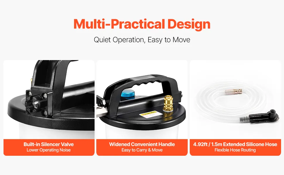 The brake fluid changer includes a built-in silencer valve to lower noise during operation. It also features a convenient carrying handle for easy movement between wheels, and a 4.92ft extended hose for flexible and convenient setup.