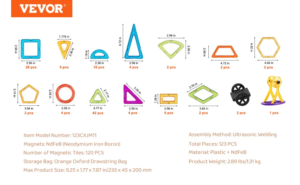 123-Piece Mega Pack: Unleash your child's creativity with the VEVOR magnetic tiles set! This exciting pack includes 123 magnetic pieces—28 squares, 42 triangles, and 16 semicircles—perfect for building tall structures, buildings, and castles that stand strong. Plus, it comes with a sturdy plastic storage box, keeping everything organized and tidy.